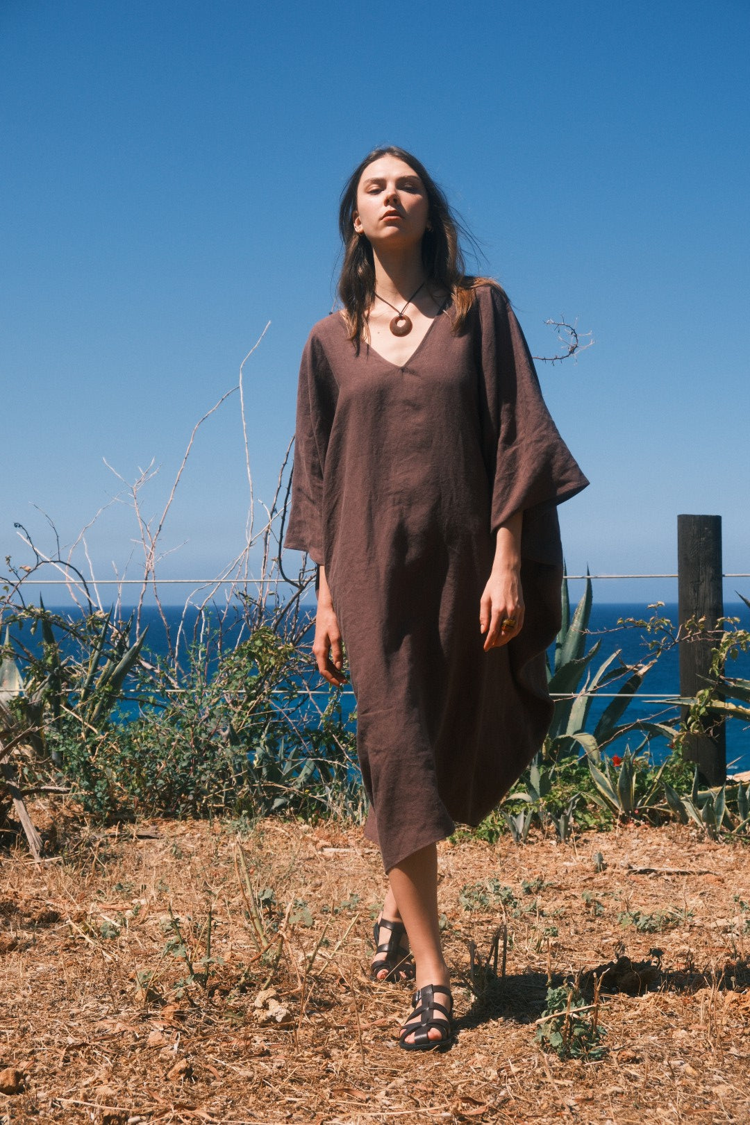 Crafted from 100% Belgian linen and Oeko-Tex® certified, this closed kaftan is designed for a relaxed fit, featuring a deep V neckline and a deep V back with a strap detail. The subtle drape of the fabric enhances its fluidity, offering a graceful silhouette. Perfect for layering over swimwear.